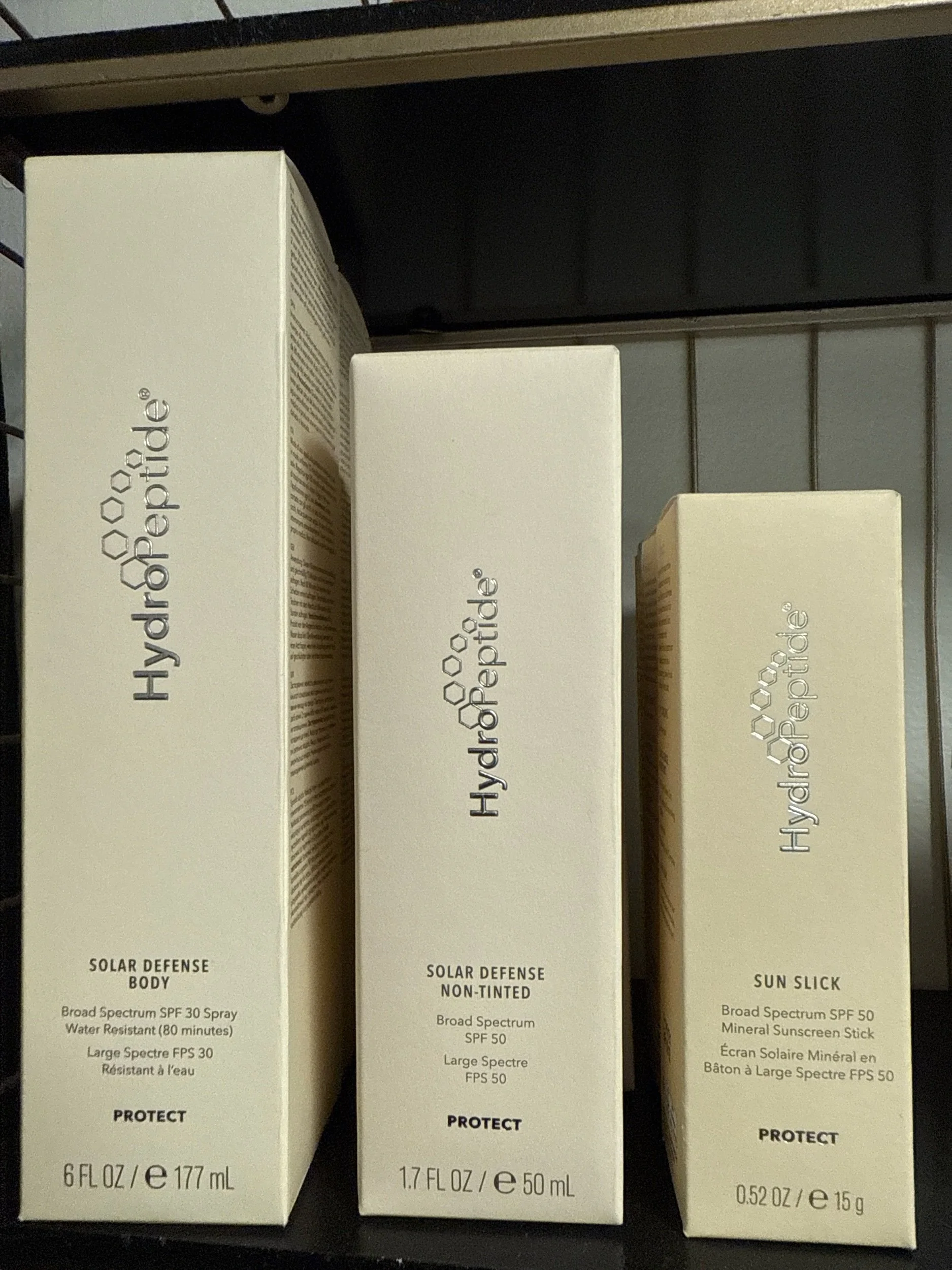 Hydropeptide solar defense body spray, Solar defense non tinted SPF cream and Solar Defense Sun Slick Stick. Conveniently bundled to keep you safe all year round. $140 value- save $25